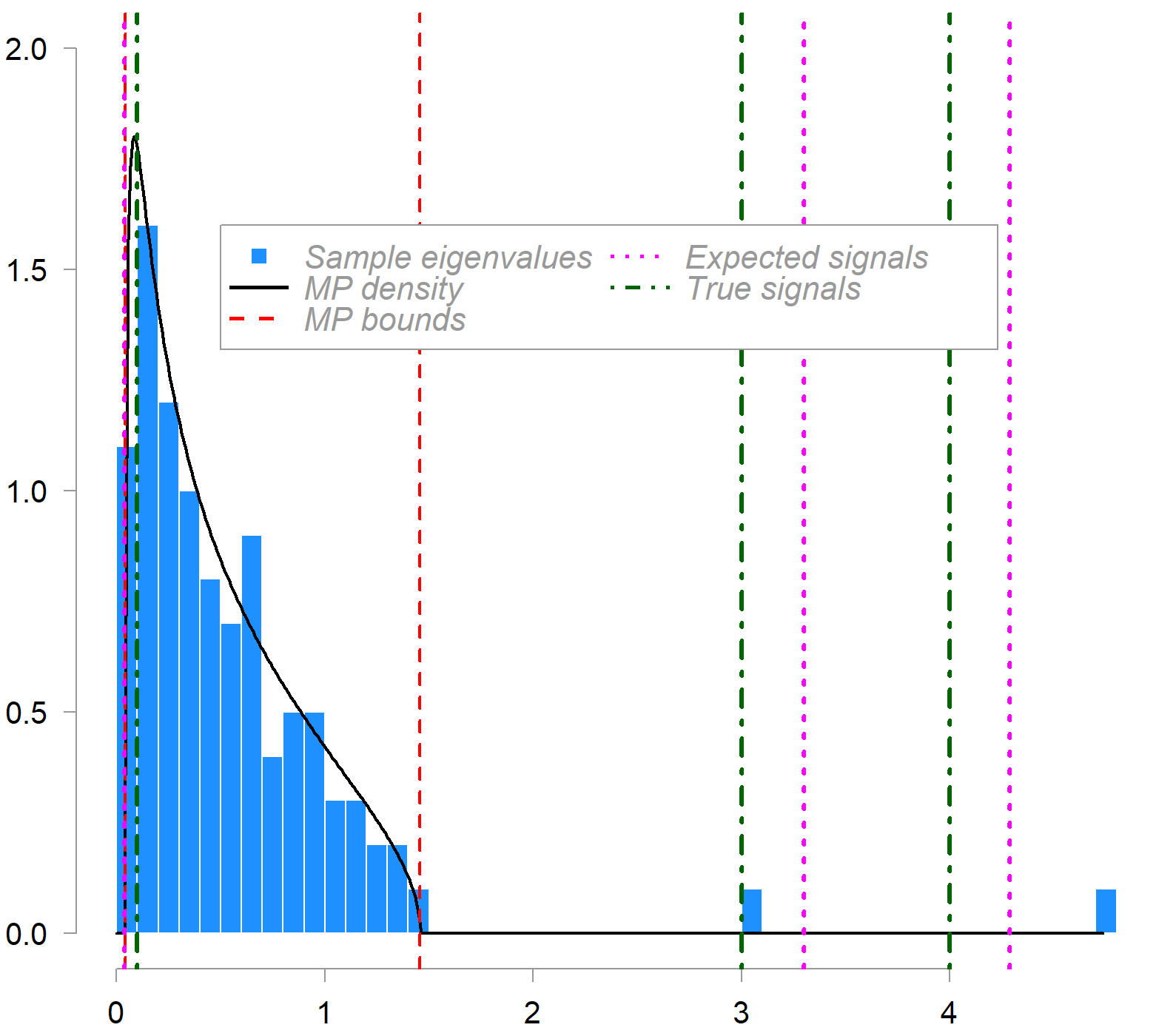 What is plotted is the empirical distribution of sample eigenvalues (blue histogram) from a 100×200 data matrix compared to the MP density (in black). The population covariance contains three (real) signal eigenvalues, indicated by the green dash-dot lines. c = 0.5 in this example. Red dashed lines mark the MP bounds. Magenta dot lines show the expected (bias-corrected) locations of sample signal eigenvalues as estimated by the inversion formula outlined above.